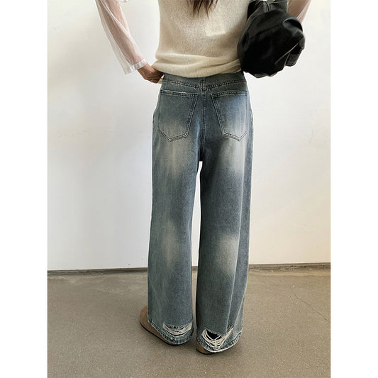 Washed Distressed Casual Loose Wide-leg Jeans Splash-ink Design Slimming Unisex Style Mop Pants Men And Women