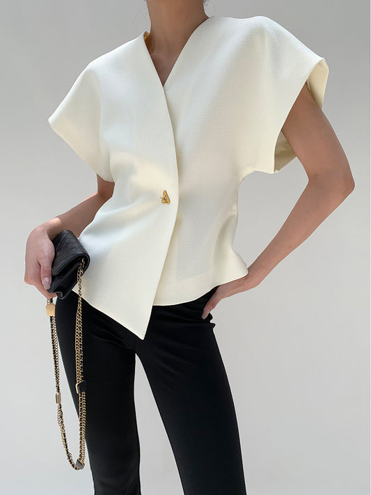 Spring and Summer Two Button White Black Irregular Single Shoulder Short Sleeve Top for Outer Wear and Inner Lap
