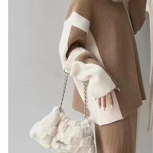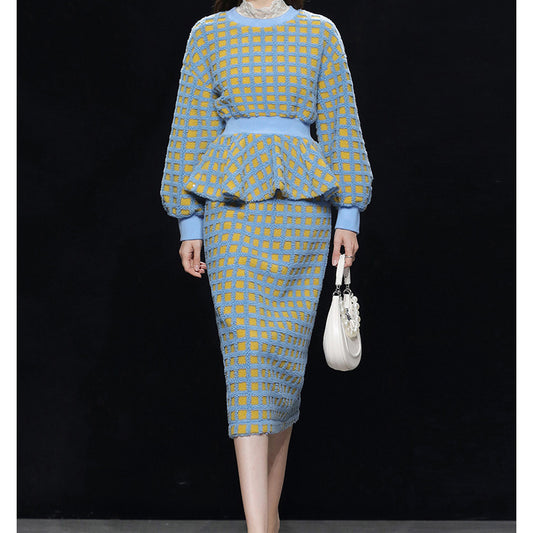 Women's Autumn And Winter Clothing New Fashion Casual Contrast Color Check Sweater Top Hip Skirt Long Dress Suit